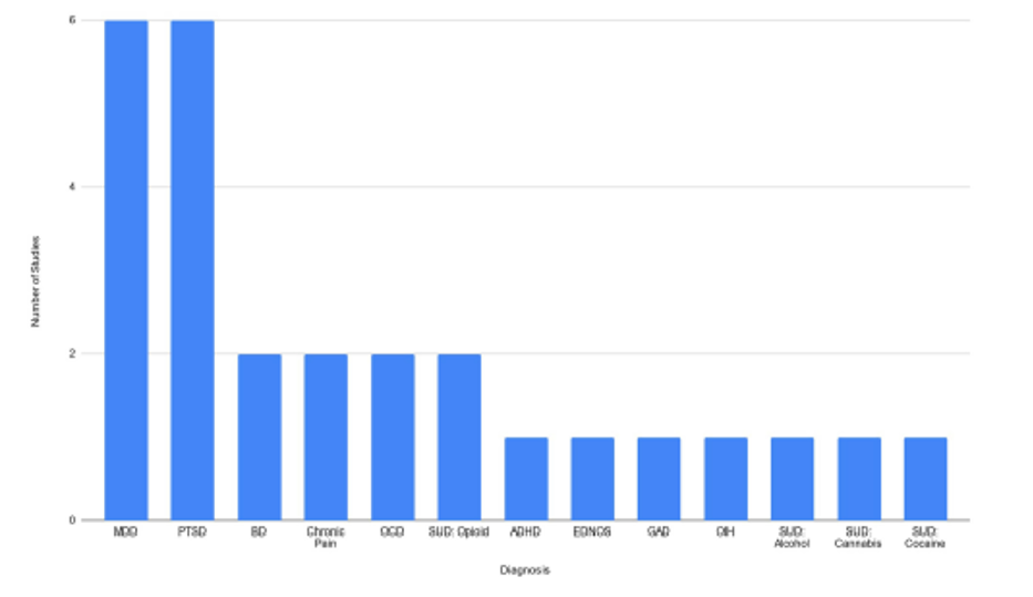 But what exactly is KAP and how can the discerning consumer know what they are buying into? The answer, as always, is to follow the literature, the evidence, the map of what actually worked. We’ve done that here for you. This graph shows the number of randomized control trials that support KAP organized by various diagnoses.