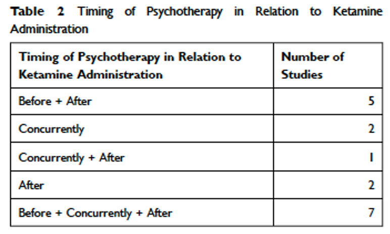 The psychotherapy component of KAP is less well defined, as is the timing. Most studies used Cognitive Behavioral Therapy or mindfulness-based interventions with the number of sessions ranging from 4 to 60 (median was 11). In our case, we often use EMDR to further amplify outcomes. The timing relative to the ketamine infusion was also variable though most studies used before, after and during or only before and after (see Table).